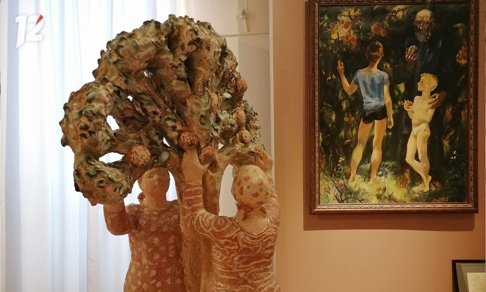 Тема яблоневого сада объединяет скульптурную композицию заслуженного художника РСФСР Людмилы Дрок, которая часто изображала за работой своих современниц, и картину «Дедушкин сад» Олега Сильянова.