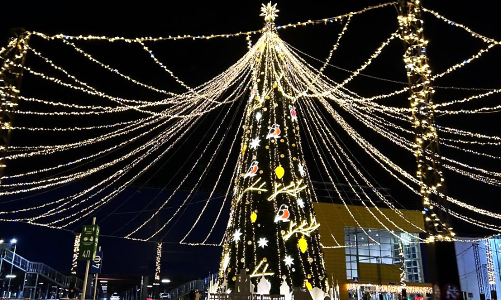 «Вокруг света» находится в парке «Зелёный остров». Больше всего это место удивляет своей красочностью. Разными цветами переливаются аттракционы, а яркими огнями горят фотозоны. Здесь снимки можно сделать возле 12-метровой новогодней ели, светящихся мостов и экрана с новогодними видеороликами.