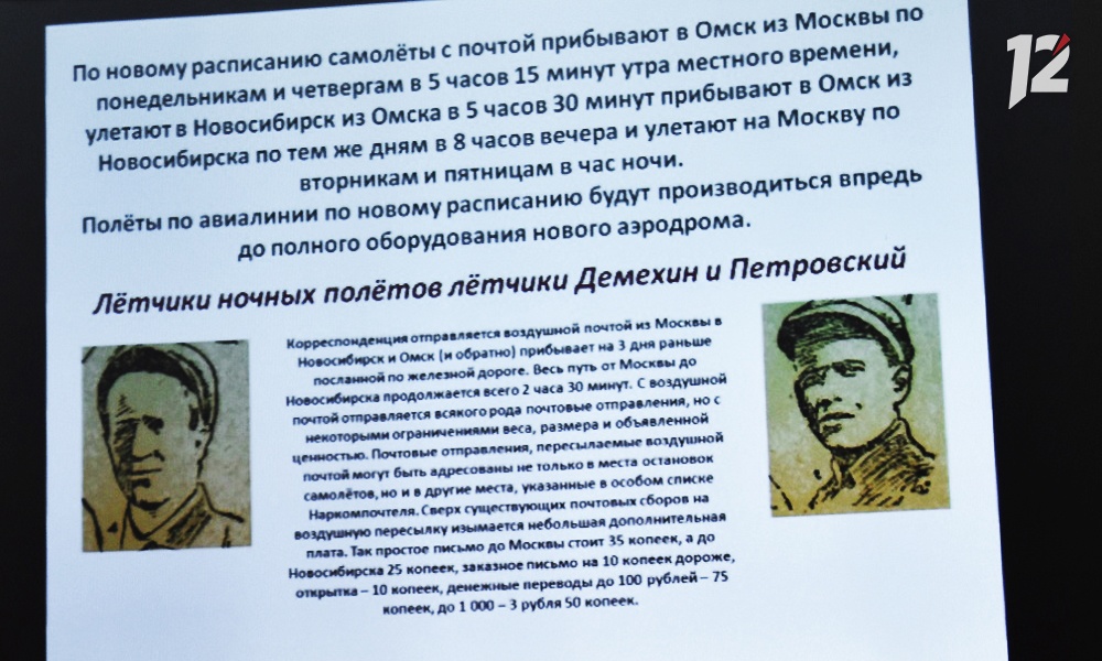 «Расстояние между Москвой и Омском самолёты покрывали за 18 часов. Они совершали три рейса в неделю. Расписание авиарейсов печаталось в газете «Рабочий путь. До любого города по линии следования цена авиабилета была равна проезду по железной дороге в международном спальном вагоне +25%. Страховка входила. Но перевозились по воздуху только работники советских военных учреждений, профсоюзных, общественных и кооперативных организаций» , — рассказала лектор.