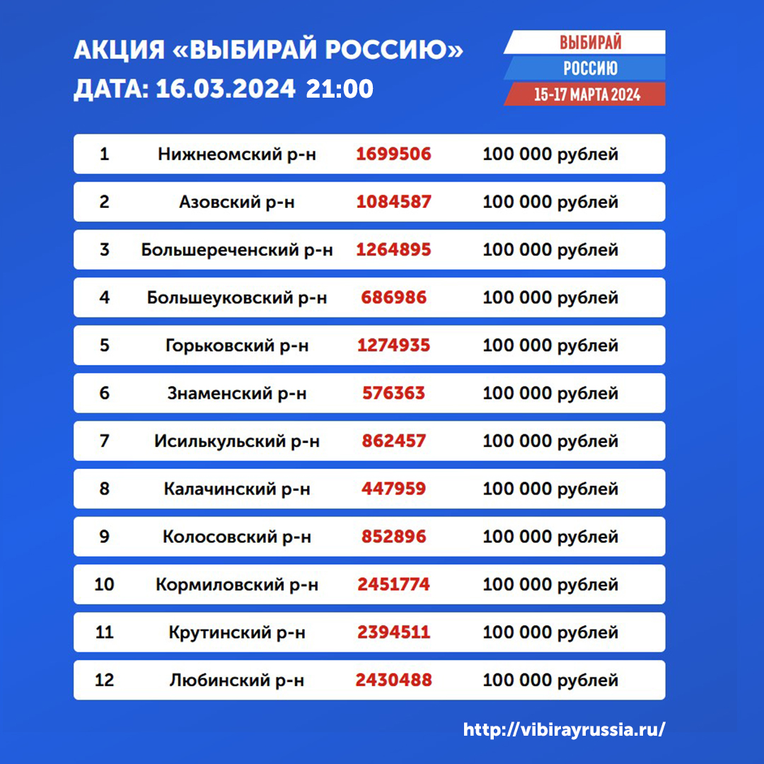 Определены победители акции «Выбирай Россию» на 21:00 16 марта