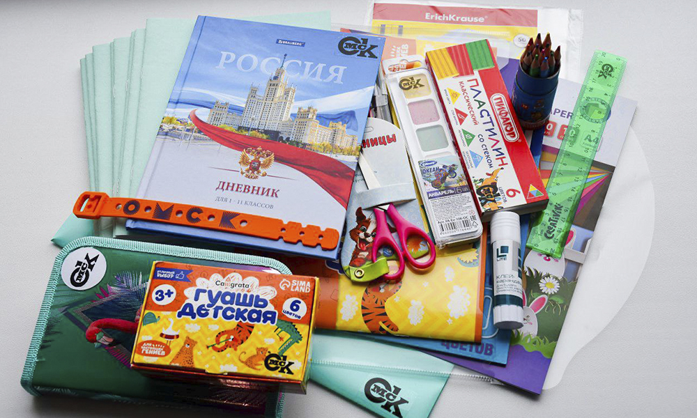 Сегодня, 19 августа, министр образования Омской области презентовал брендированные рюкзаки: сбоку на них имеется флаг России и герб нашего региона. Внутри полный набор первоклассника: дневник, тетради в клетку и линейку, обложки, папки-конверты на кнопке, пенал, простые карандаши, ластик, точилка, ножницы, ручки, линейка, цветные карандаши, фломастеры, пластилин, акварель и гуашь, кисть для рисования, альбом для рисования, цветная бумага, цветной картон.