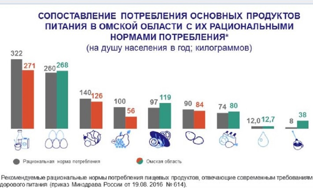 Омичам советуют употреблять больше овощей, фруктов и молочной продукции. Как показывает статистика, потребление этих продуктов значительно ниже установленной нормы.