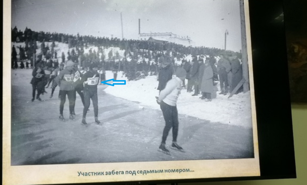 «Фотография сделана в Омске в 30-е годы. На катке, устроенном в зимнее время на льду Оми в районе нынешних улиц Гагарина и Бударина проходят соревнования конькобежцев. Второй справа бородатый конькобежец с нагрудным номером 7 — известный учёный и поэт Пётр Драверт. Этот снимок интересен тем, что нигде в биографии Драверта не упоминается о его любви к конькам, хотя, возможно, он владел мастерством катания на коньках ещё с тем пор, как был гимназистом», — рассказал Олег Милищенко.