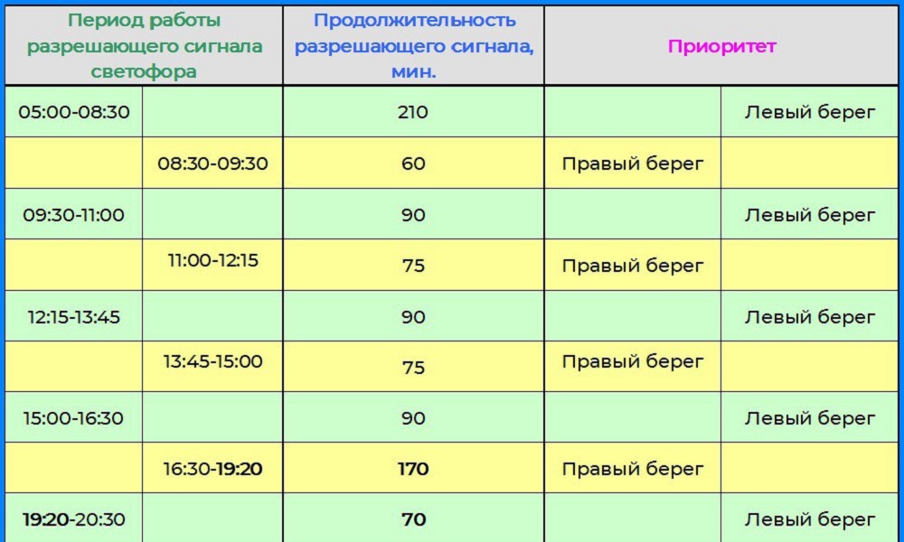 Изменения вступили в силу с сегодняшнего дня. Основные изменения затронули одну фазу регулирования — теперь вечером зелёный сигнал для автомобилей, следующих от Левого берега, включается раньше, начиная с 19:20, а не с привычных ранее 19:45. Принятые меры связаны с перераспределением транспорта по альтернативным маршрутам. Водителей просят учитывать скорректированное расписание светофоров.