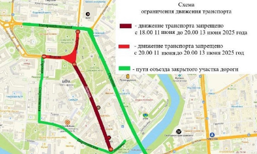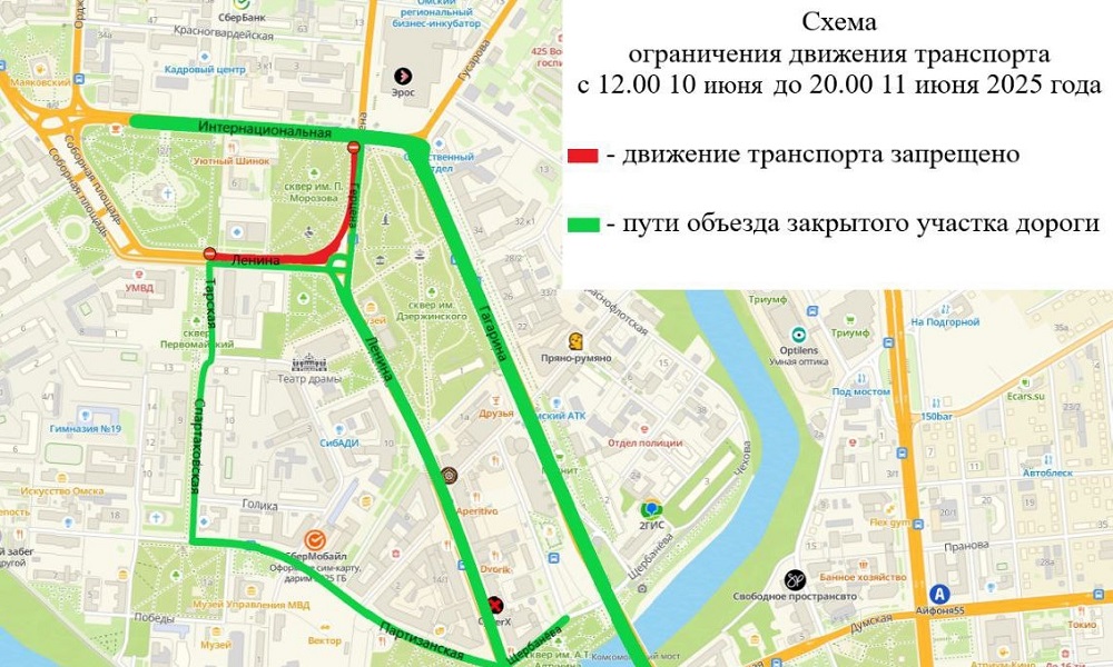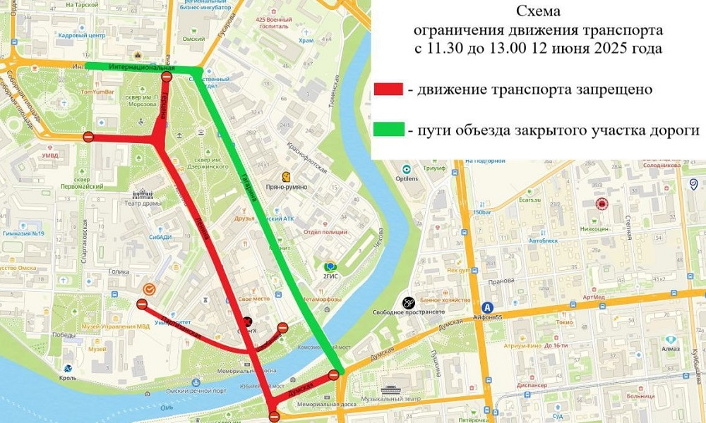 Согласно информации, предоставленной департаментом общественной безопасности администрации города Омска, проезд будет закрыт на следующих участках: - С 12:00 10 июня до 20:00 11 июня