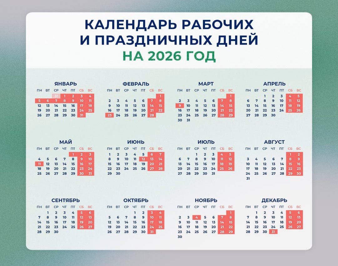 Минтруд опубликовал предварительный календарь рабочих и праздничных дней на 2026 год