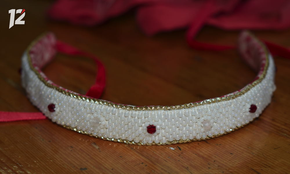 «Девушки часто просят меня сшить вот такое украшение на шею. Оно называется пёрлышко, от слова перлы — жемчуг. Это тонкая полоска ткани, там внутри бель, а украшение — бисер. Можно расшить и жемчугом. Сейчас эту вещь называют чокер», — отметила Ирина Казакова.