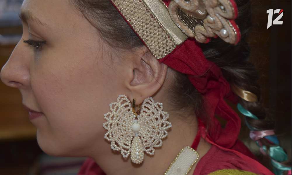 Кроме венца, созданного по образцу музейного экспоната из Архангельской губернии, Ирина сделала и популярные в XIX веке серьги в форме бабочек. В старину при их изготовлении жемчужинки нанизывали на конский волос. В реплике использованы бисер и леска.