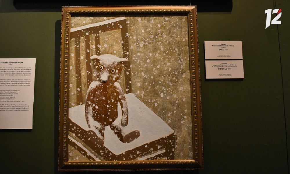 А есть на выставке живописные работы совсем свежие, которые авторы привезли прямо из мастерской. Например, этого трогательного мишку под снегом Владимир Чупилко написал в 2025 году.